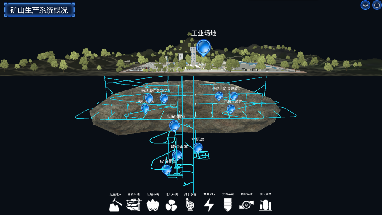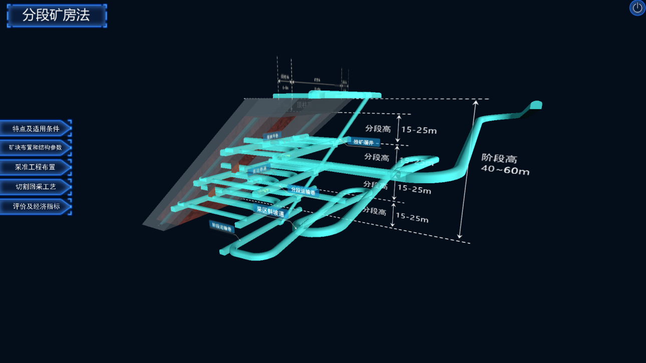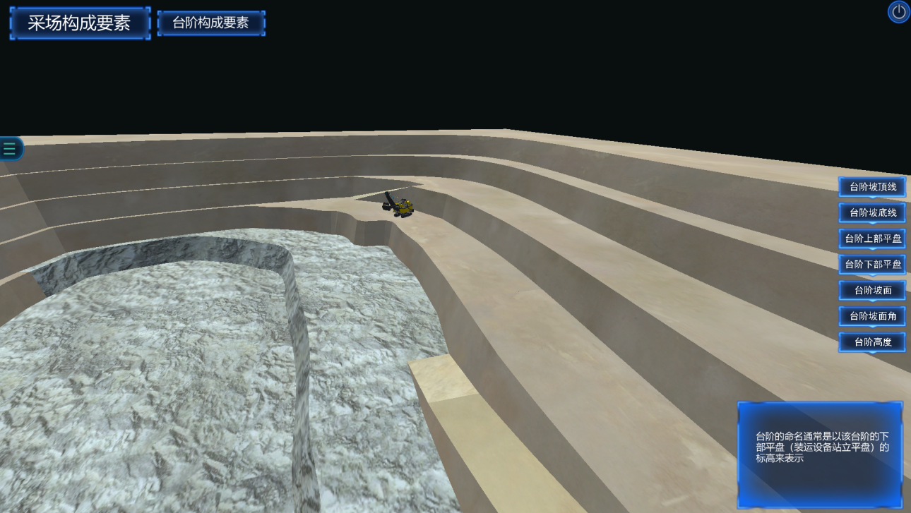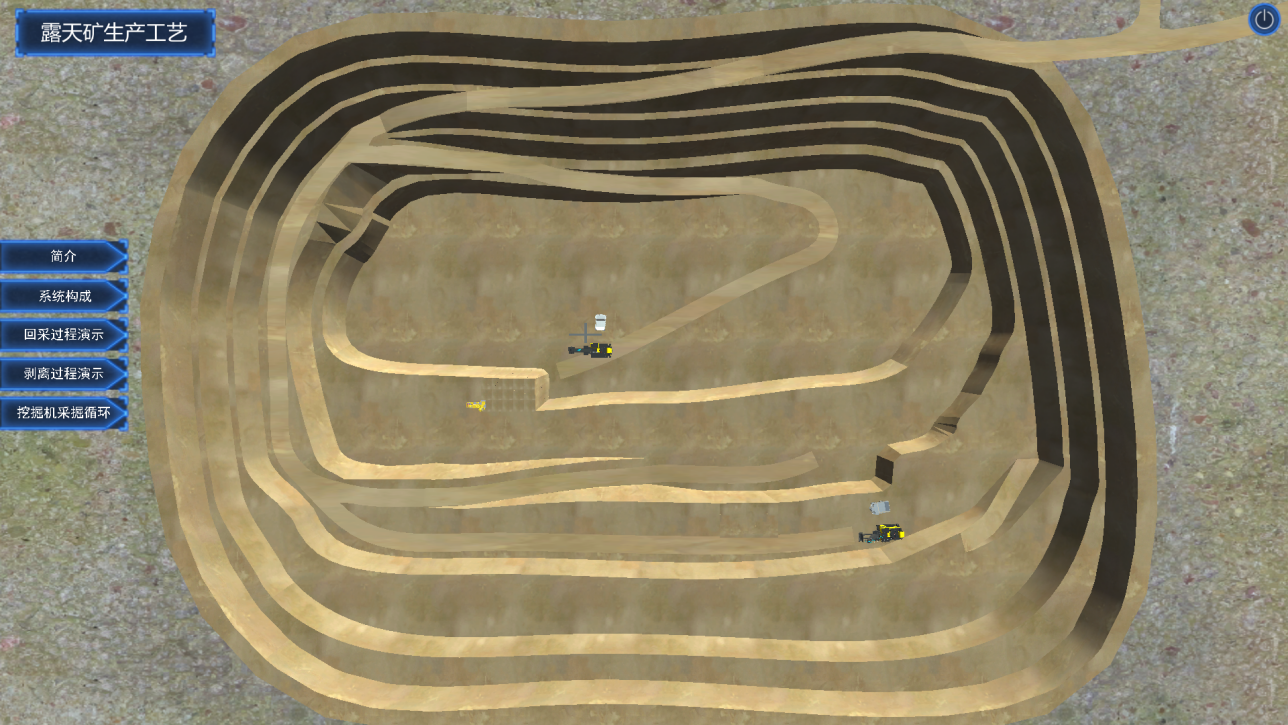 系統(tǒng)構(gòu)建露天和地下礦山真實場景,對工業(yè)廣場,生產(chǎn)系統(tǒng),采礦方法和采裝設(shè)備等進行虛擬仿真,充分解決了采礦工程專業(yè)教學(xué)不直觀,現(xiàn)場實習(xí)成本大的問題,直觀的教學(xué)模式也能充分激發(fā)學(xué)生的自主能動性。